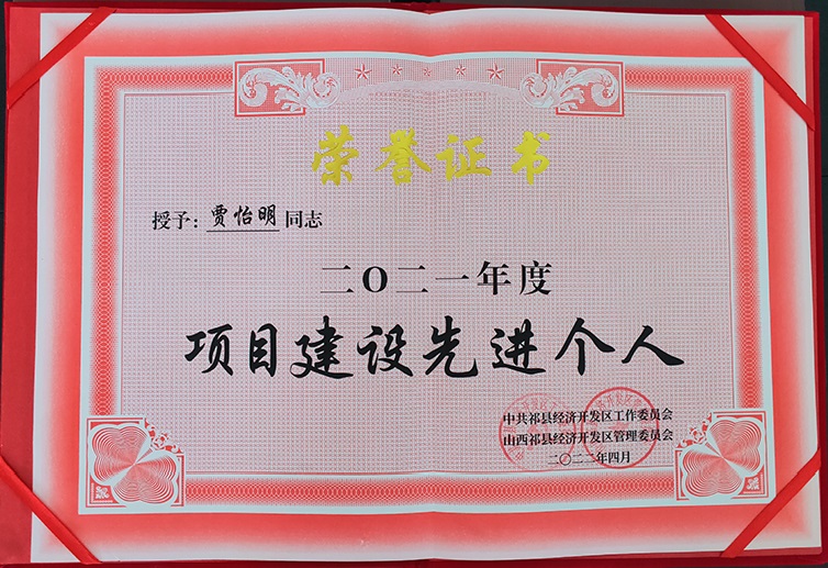 公司董事長賈怡明同志,在2021年開發(fā)區(qū)項目建設(shè)先進(jìn)表彰大會上,被中共祁縣經(jīng)濟開發(fā)區(qū)工作委員會和山西祁縣經(jīng)濟開發(fā)區(qū)管理委員會共同授予“二〇二一年度項目建設(shè)先進(jìn)個人”榮譽稱號。